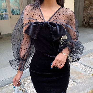 Sheer Lantern Sleeve Elegant Velour Dress