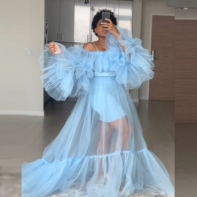 Puffy Long Sleeve Sheer Tulle Maxi Dress