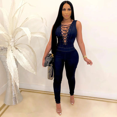 • Sleeveless Eyelet Straps Denim Jumpsuit