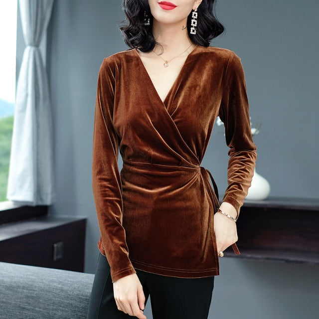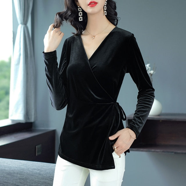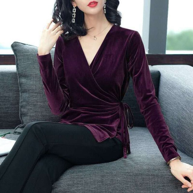 • Load image into Gallery viewer, Sashed V Neck Velour Top