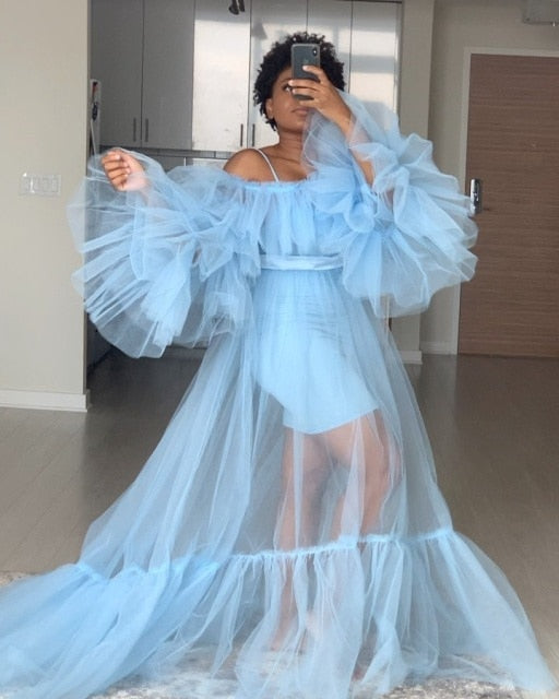Puffy Long Sleeve Sheer Tulle Maxi Dress