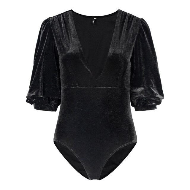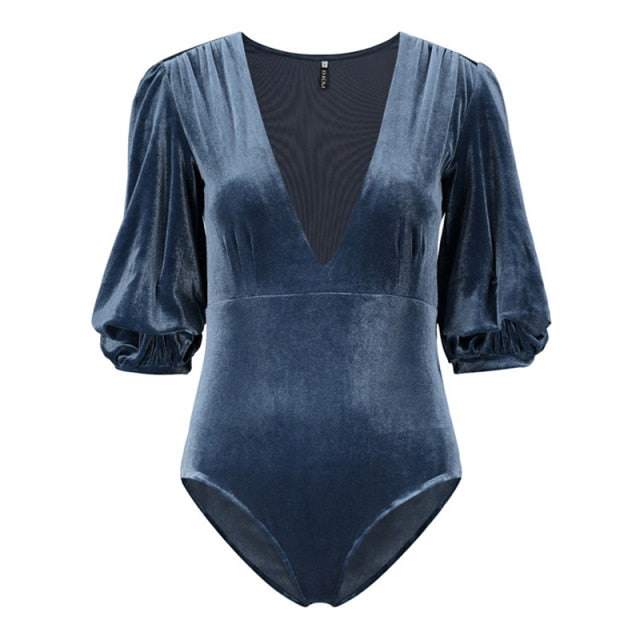 Velour Deep V Neck Lantern Sleeve Bodysuit